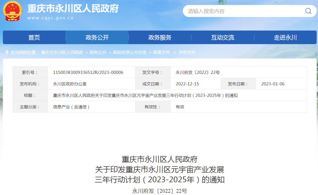 1月6日,重庆市永川区人民政府官网发布《重庆市永川区元宇宙产业发展三年行动计划(2023—2025年)》。